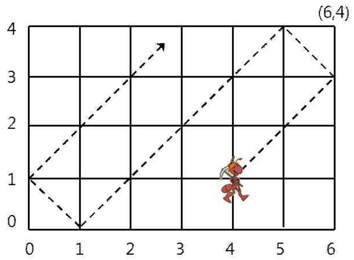 위 그림은 6×4 격자에서 처음에 (4,1)에서 출발한 개미가 움직인 길을 보여주고 있다. 처음에 (4,1)에 있는 개미는 2시간 후에 (6,3)에 있으며 8시간 후에 (0,1)에 있다. 만일 그 개미가 처음에 (5,3)에 있었다면 매 시간마다 (6,4), (5,3), (4,2), (3,1)로 움직인다.