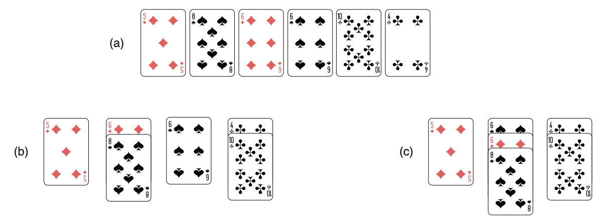 Figure (a) below shows a configuration with six cards at the beginning of the game. The player may move the fifth pile on top of the sixth pile, and then the second pile on top of the third pile; since no more movements are available, this would conclude the game with four piles remaining, as it can be seen in figure (b). However, in this case it is possible to end up the game with just the three piles that appear in figure (c).