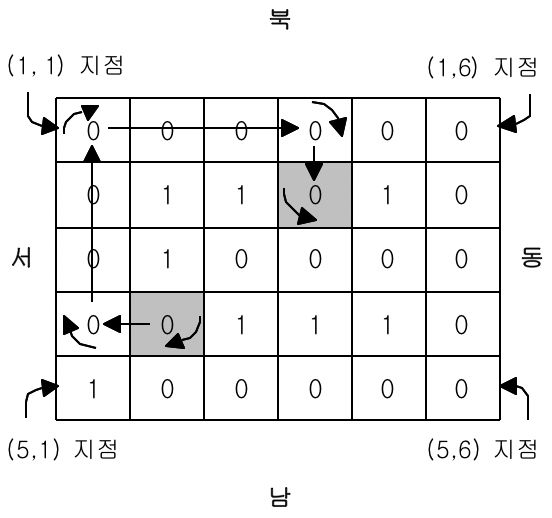 공장 내 궤도가 설치되어 있는 상태가 아래와 같이 0과 1로 이루어진 직사각형 모양으로 로봇에게 입력된다. 0은 궤도가 깔려 있어 로봇이 갈 수 있는 지점이고, 1은 궤도가 없어 로봇이 갈 수 없는 지점이다. 로봇이 (4, 2) 지점에서 남쪽을 향하고 있을 때, 이 로봇을 (2, 4) 지점에서 동쪽으로 향하도록 이동시키는 것은 아래와 같이 9번의 명령으로 가능하다.