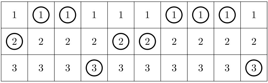 Kupon do Gry w liczby zawiera n pozycji. Na każdej z nich można zakreślić jedną z liczb 1, ..., k. Poniższy rysunek przedstawia przykładowe wypełnienie kuponu dla n = 10 i k = 3: