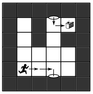 In order to reach the cake faster you have acquired a portal gun from Aperture ScienceTM, which operates as follows. At any time it can fire a portal in one of the four directions up, left, down and right. When a portal is fired in some direction, it will fly in that direction until it reaches the first wall. When this happens, a portal will be spawned on the wall block, on the side that faces you.