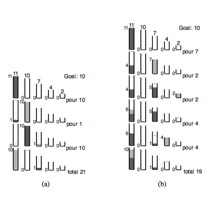 As a final example, you start with cups of capacities 11, 10, 7, 4, and 2, with the 11-cup full, and a goal of ending up with 10 units in the 11-cup. Obviously, you could fill the 10-cup, dump the remaining 1 unit into another cup, and then pour from the full 10-cup back into the 11-cup, as illustrated in Figure E.2(a). These three pours would mean transferring a total volume of 10 + 1 + 10 = 21. Figure E.2(b) shows a sequence with more steps, but less liquid poured.