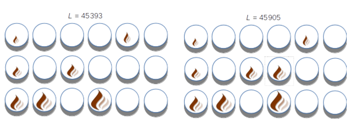 The Impressively Calculable Pyrotechnics Company has been contracted to provide certain stage effects for a rock festival. In particular, fire is requested (because fire makes the crowd go wild). In order to pull this off, the main stage is outfitted with a series of tubes, each specially calibrated to deliver a flame burst of a particular luminosity. In all, there are 18 numbered tubes arranged on the stage as follows: