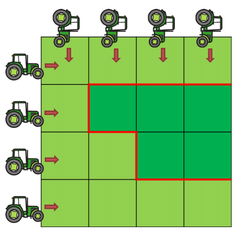 When harvesting, his tractors need to move both horizontally and vertically across all the land. In the image, you can see a region at low altitude in light green and a region at high altitude in dark green. When harvesting, his tractors will have to cross all the hills marked in red and they will have to go up or down 8 times.