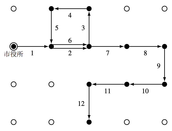 黒丸はジョイ君が印を付けた交差点,白丸はジョイ君が印を付けていない交差点,二重丸は市役所のあ る交差点,数字は各ステップを表す.