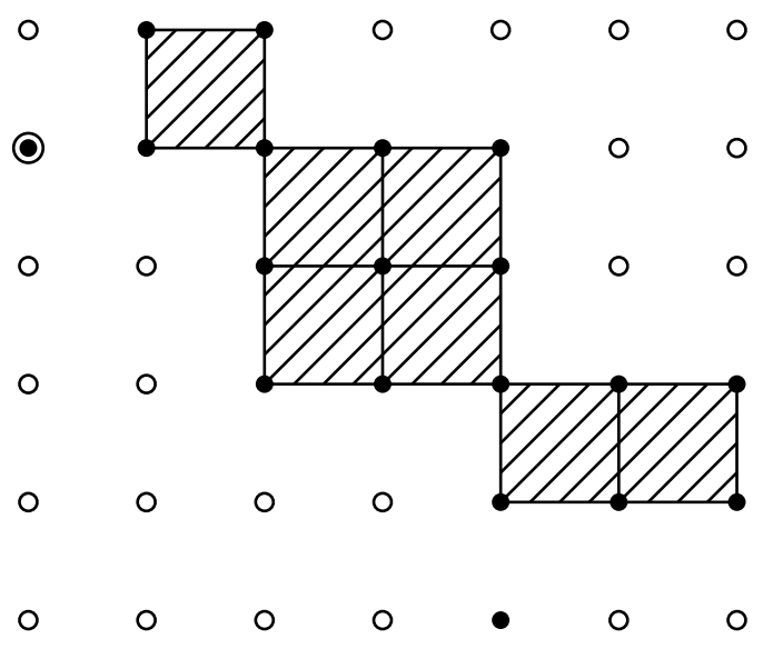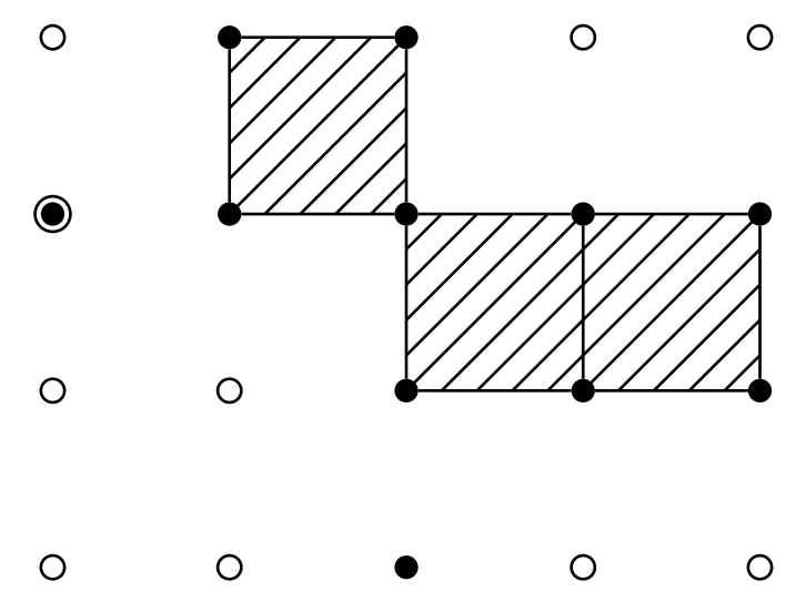 入力例 2 では,散歩が 2 日間に渡り行われる.それぞれの日の移動経路は入力例 1 と同一である.散歩 が完了したとき,下図の斜線部分で示された 7 個の区画がジョイ君の縄張りに属する.