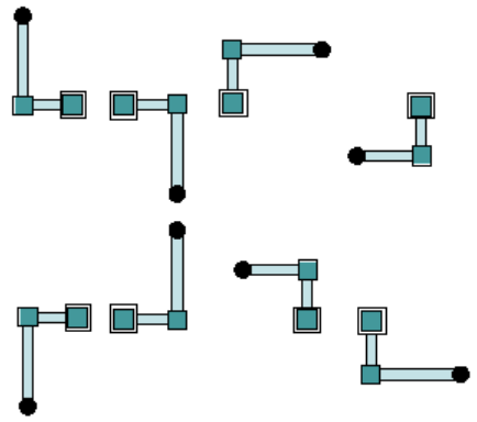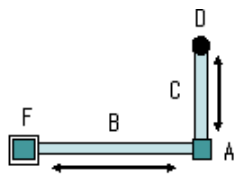 공장에서 작업을 하는 로봇은 고정 축 F, 한 개의 관절 A, 두개의 뼈대 B, C와 손 D로 구성되어 있다. 그림 1과 같이 고정축 F는 공장 내부의 한 점에 고정되어 있고, 뼈대 B는 고정축 F와 관절 A사이를 연결하고, 다른 뼈대 C는 관절 A와 손 D사이를 연결한다.