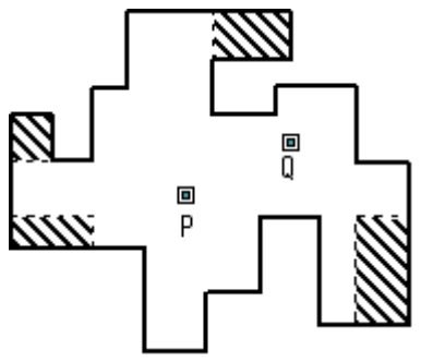 로봇의 고정축이 위치한 공장은 그림 3과 같이 수평 방향과 수직 방향의 벽들이 번갈아 가면서 연결되어 있는 하나의 다각형으로 구성되어 있다. 따라서, 이 공장의 내부에는 벽들이 존재하지 않는다. 이 공장 내부의 어떤 위치에 로봇의 고정축 F를 고정시켰을 때, 위의 세 가지 조건들을 만족하면서 뼈대 B와 C의 위치와 길이를 조절하더라도 로봇의 손 D가 미치지 못하는 공장 내부의 지점이 있을 수 있다.
