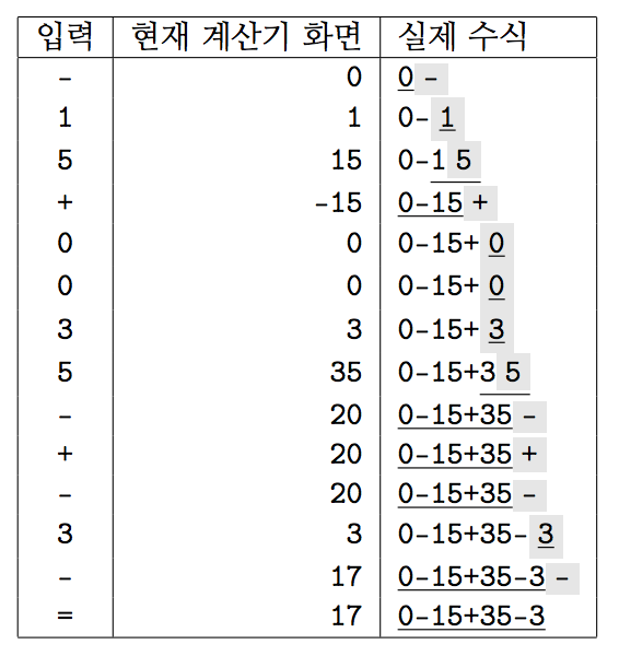 예를 들어, ‘-15+0035-+-3-’을 계산기에 순서대로 입력하고, 마지막에 ‘=’ 버튼을 누르는 과정을 표로 나타내면 다음과 같다.