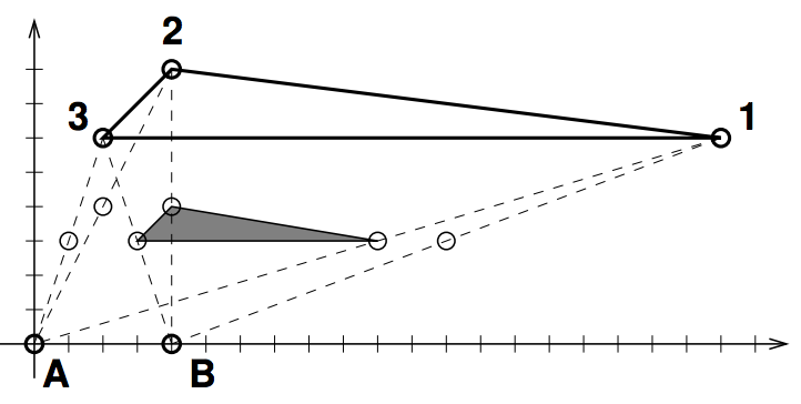 Um Kit de Encolhimento de Polígonos é um material muito utilizado nas aulas de magia geométrica na Nlogônia. O kit consiste de dois pontos, A e B no plano cartesiano. Considere um polígono convexo dado pelos vértices 1, 2...N, nessa ordem. Para encolher esse polígono usando o kit, algumas regras devem ser respeitadas. Cada vértice x do polígono deve ser movido uma vez só: para o ponto médio do segmento Ax ou para o ponto médio do segmento Bx. A operação de encolhimento deve produzir um novo polígono convexo que preserve a ordem relativa dos vértices do polígono original. Em outras palavras, considerando todas as possíveis maneiras de aplicar o kit, apenas aquelas cuja sequência final dos vêrtices 1, 2...N representa um polígono convexo são válidas. Veja que o polígono convexo original pode estar em sentido horário e uma operação de encolhimento válida produzir um polígono convexo em sentido anti-horário, na mesma ordem dos vértices. Apenas a ordem relativa dos pontos é importante, não o sentido.