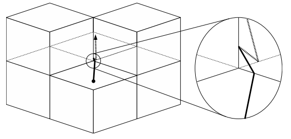 The maintenance robot can move only on the surface of the polycubes, that is, on faces not in common with other cubes. In addition, due to the structure of the colonies, move of the robot beyond a face is restricted to the following cases: (a) the robot is moving between adjacent faces of the same cube; (b) the robot is moving between adjacent faces of adjacent cubes; and (c) the robot is moving along the inner side of an L-shape, namely, the robot is moving between adjacent faces of two cubes that have the common adjacent cube. Here, adjacent faces denote those with the common edge, and adjacent cubes denote those with the common face.
