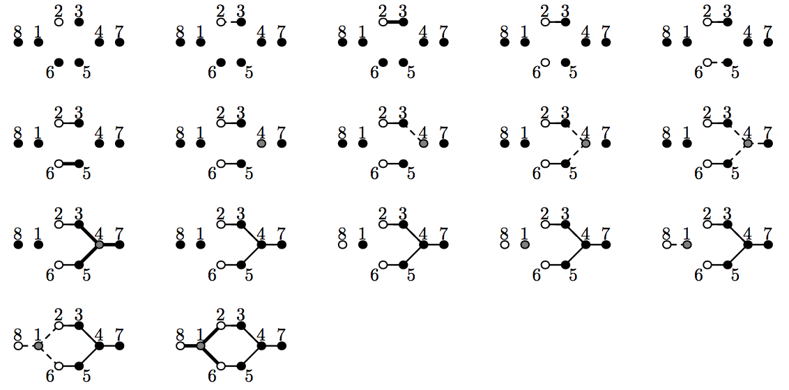 The following picture visualizes the sequence 17 operations from the first sample output. If an edge is not created yet, but its vertices are already in one graph, then this edge is drawn as dashed.