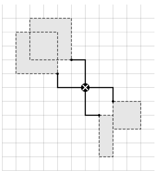 Nakon što su odlučili koje kvartove osvjetliti, tvrtka želi pronaći raskrižje na kojem je najpovoljnije postaviti elektranu. Cijena postavljanja elektrane jednaka je zbroju udaljenosti elektrane od svakog kvarta. Udaljenost elektrane od jednog kvarta jednaka je zbroju broja ulica i avenija koje se nalaze između elektrane i najbližeg vrha tog kvarta. Na slici je prikazan jedan mogući odabir kvartova i smještaj elektrane.