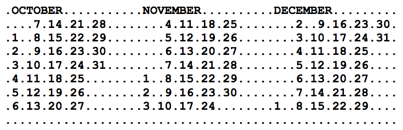 Kalendar neke nepoznate godine je zapisan u velikoj matrici znakova. Svaki element matrice je ili veliko slovo engleske abecede ili znamenka ili točka. Kalendar je napravljen na sljedeći način: