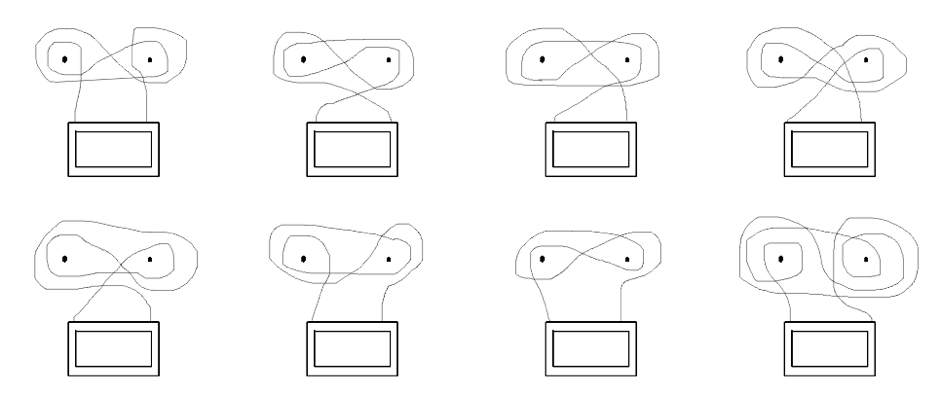 위 그림은 조건을 만족하도록 실을 감는 방법 중 감은 횟수가 4회로 가장 적은 서로 다른 8가지이다. 맨 왼쪽 위의 경우는 실을 잡고 왼쪽 못에 반시계 방향으로 감은 후, 오른쪽 못에 시계 방향으로 감고, 왼쪽 못에 시계 방향으로 감고, 오른쪽 못에 반시계 방향으로 감은 모양이다. 즉, 감은 횟수는 4회이고 감은 순서는 (왼쪽, 반시계), (오른쪽, 시계), (왼쪽, 시계), (오른쪽, 반시계)이다.