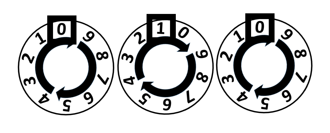 It is also possible to advance from digit 9 to digit 0. However, when this happens, the wheel on its immediate left will also advance to the next digit automatically. This can have a cascade effect on multiple wheels to the left, but they all happen in a single step.