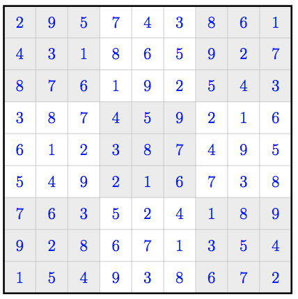 +---+---+---+---+---+---+---+---+---+ | 2 9 5 | 7 4 3 | 8 6 1 | + + + + + + + + + + | 4 3 1 | 8 6 5 | 9 2 7 | + + + + + + + + + + | 8 7 6 | 1 9 2 | 5 4 3 | +---+---+---+---+---+---+---+---+---+ | 3 8 7 | 4 5 9 | 2 1 6 | + + + + + + + + + + | 6 1 2 | 3 4 7 | 4 9 5 | + + + + + + + + + + | 5 4 9 | 2 1 6 | 7 3 8 | +---+---+---+---+---+---+---+---+---+ | 7 6 3 | 5 2 4 | 1 8 9 | + + + + + + + + + + | 9 2 8 | 6 7 1 | 3 5 4 | + + + + + + + + + + | 1 5 4 | 9 3 8 | 6 7 2 | +---+---+---+---+---+---+---+---+---+ 2 2 45 5 2 45 8 2 45 2 5 45 5 5 45 8 5 45 2 8 45 5 8 45 8 8 45