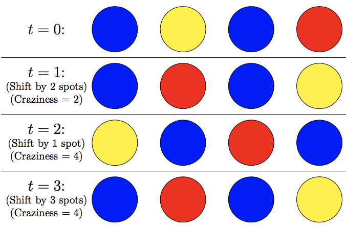 Cynthia has a long line of n coloured lights. These lights will be animated by rotating the colours of the lights. To rotate the colours by k spots, the colour of light i at time t is the same as the colour of light (i − k) mod n at time t − 1. When Cynthia does this, there may be several lights that change colour. The craziness of a rotation by k spots is the number of lights that change colour. For example, in Figure C.1, rotating the colours by one spot changes the colour of six lights, so the craziness of this rotation is 6.
