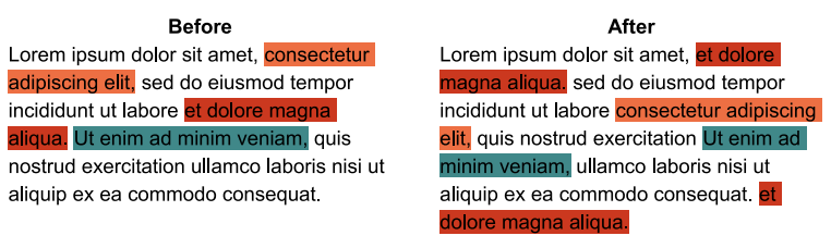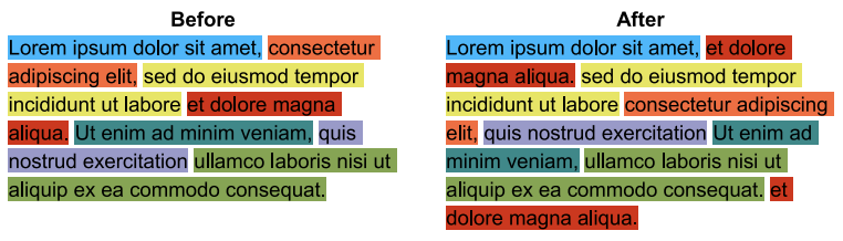We are now onto the next stage of development of Intuidiff. After some preprocessing, the original document has been broken up into several non-overlapping substrings, and each of these has been assigned a different colour (for example, see the ‘Before’ paragraph in Figure I.1). Then, in the modified document, the substrings are coloured using the same colours as those in the original document (for example, see the ‘After’ paragraph in Figure I.1). This allows us to see how large substrings have moved in the document. Substrings with the same colour may appear multiple times in the ‘After’ section, but only once in the ‘Before’ section. For example, the substring “et dolore magna aliqua.” appears twice in the modified document of Figure I.1.