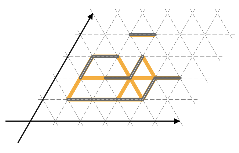 U jednom nakrivljenom gradu, staze i ulice se ne grade tako da se sijeku pod pravim kutom, već uvijek pod kutom koji je višekratnik od 60 stupnjeva. Točnije, grad možemo smjestiti u trokutastu mrežu odnosno koordinatni sustav u kojemu x i y osi zatvaraju kut od 60 stupnjeva kao na slici dolje. Ako su A i B točke sa cjelobrojnim koordinatama onda su one susjedi ako je njihova Euklidska udaljenost jednaka 1. Primijetite da sva točka ima točno 6 susjeda.