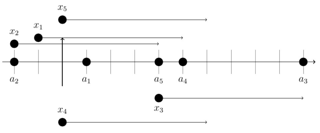 For the first example, one possible solution is to choose x1 = −1, x2 = −2, x3 = 4, x4 = 0, x5 = 0, which is illustrated below.