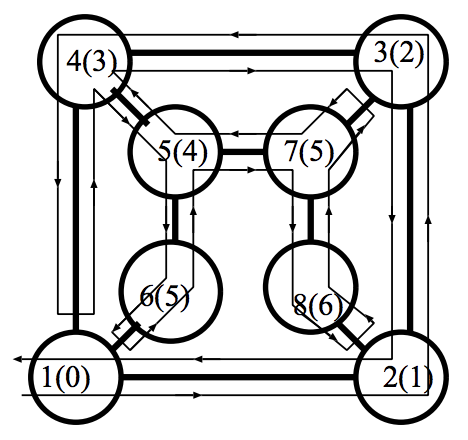I have a counter with me to memorize the distance from the first room. The counter is incremented when I enter a new room, and decremented when I go back from a room. In Figure 2, each number in parentheses is the value of the counter when I have entered the room, i.e., the distance from the first room. In contrast, the numbers not in parentheses represent the order of my visit.