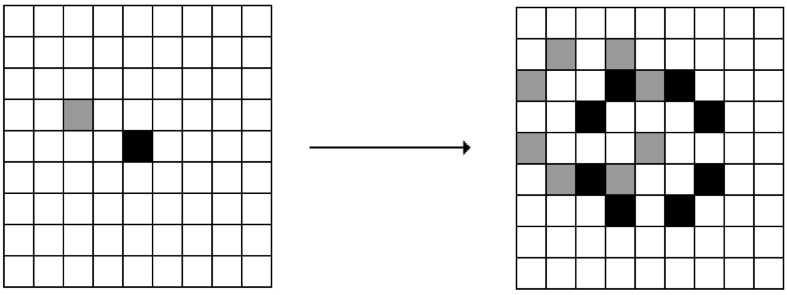 통학이 너무나도 하기 싫었던 영우는 결국 학교의 기숙사에 들어갔다. 통학의 고통에서 해방된 기쁨도 잠시, 학교 기숙사에서는 일정 기간마다 청소 검사를 한다는 사실을 알게 되었다. 청소 검사에서 나쁜 점수를 받으면 벌점을 받게 되고, 벌점이 많이 쌓이면 기숙사에서 퇴사 해야 한다. 영우는 어떤 경우에 벌점을 받는지 궁금하여 기숙사에서 진행하는 청소 검사 시스템에 대해 자세히 조사해 보았다. 기숙사 청소 검사 시스템은 오늘로부터 정확히 t 일이 지나고 검사를 하며, 검사 시간 단축을 위해 방의 특정 부분만 검사한다. 하지만 검사하는 특정 부분 중 한 곳이라도 더럽다면 영우는 벌점을 받게 된다. 영우가 사는 방은 N * N 정사각형 방이며, 기숙사 방바닥에는 곰팡이가 서식하고 있다. 곰팡이는 1 일이 지날 때마다 특이한 방식으로 증식하는데, 그림 1(a)의 곰팡이는 1 일이 지나면 그림 1(b)와 같이 8 군데로 증식되고, 원래의 곰팡이는 사라진다. 만약 곰팡이가 증식해야 하는 부분이 벽으로 막혀 있다면, 그곳으로는 증식하지 못한다. 그림 2 는 두 군데의 곰팡이가 1 일이 지난 후 모습이다.