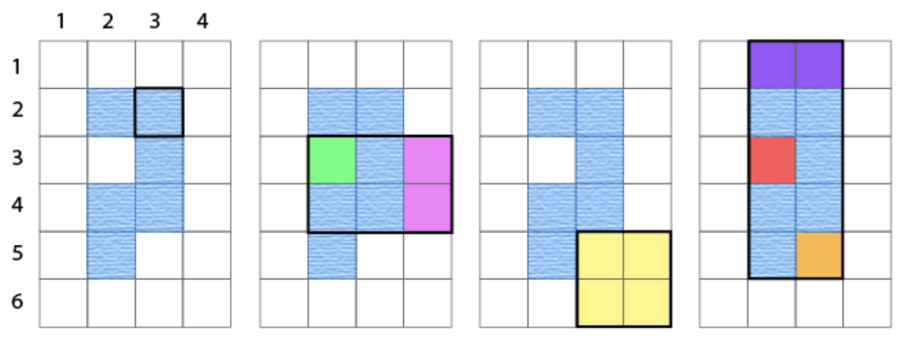 3 | The river separates the land cells into three regions: the first region containing the cells (1, 2) and (1, 3), the second region containing the cell (3, 2) and the third region containing the cell (5, 3).Therefore the maximum number of different colours you can choose is 3. |