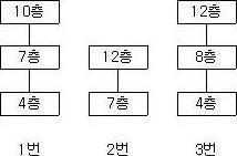 예를 들어 아파트가 총 12층이고, 엘리베이터가 3대 있으며, 각 엘리베이터가 다음과 같이 운행한다고 하자.