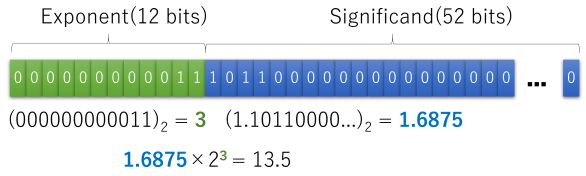 As binary number representation is convenient on computers, let's consider binary scientific notation with base two, instead of ten. In binary scientific notation, all numbers are written in the form m × 2e. Since the base is two, m is limited to be less than 2. For example, 13.5 is equal to 1.6875×23, so we can express it in binary scientific notation with significand 1.6875 and exponent 3. The significand 1.6875 is equal to 1 + 1/2 + 1/8 + 1/16, which is 1.10112 in binary notation. Similarly, the exponent 3 can be expressed as 112 in binary notation.