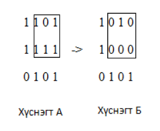 Мөр нь дээрээс доош, багана нь зүүнээс баруун тийш дугаарлагдсан зөвхөн 0 болон 1 гэсэн тоонуудаас тогтсон тоон хүснэгт өгөгдсөн байв.