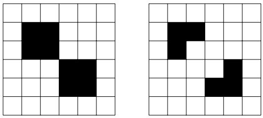 The initial state is called the seed of the system. For k ∈ N∗, we say that a state of the game has period k if, when the game is at this state, then we get back at exactly the same state k steps later. For instance, the configuration illustrated in the left diagram of Figure 2 has period 2: after one step, we obtain the configuration illustrated in the right diagram, and after one step we obtain again the configuration illustrated in the left diagram.