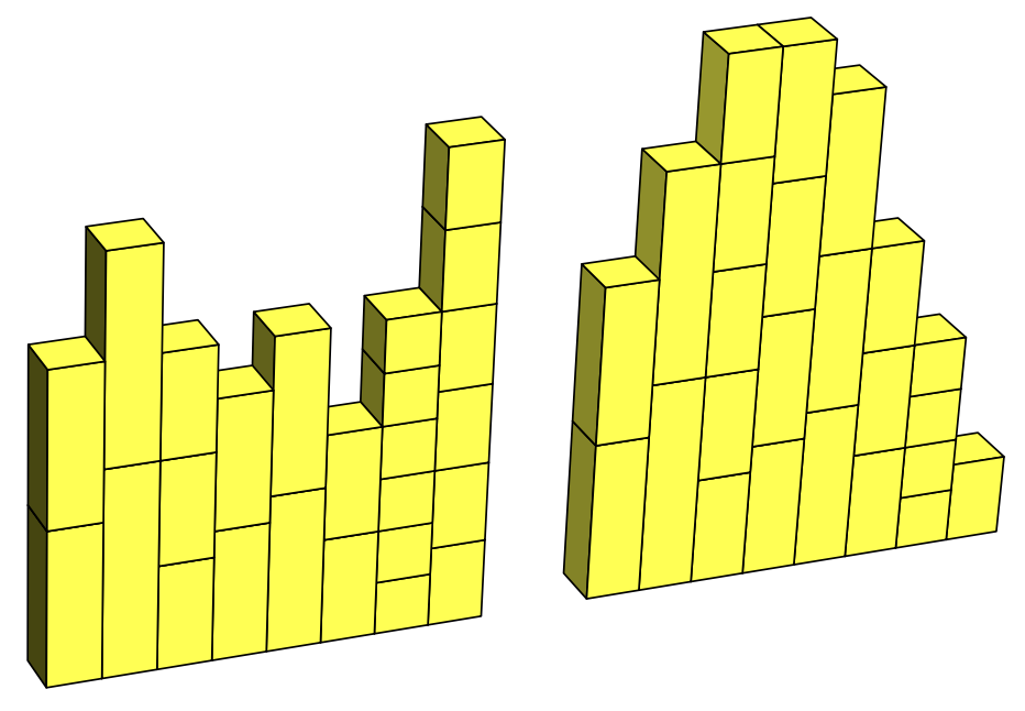 Aaron has a large supply of blocks and has challenged Andrew to build a structure out of them. All of the blocks are k × 1 × 1 for various values of k. The structure must be made up of n nonempty columns lined up in a sequence such that all blocks in column i have dimensions hi × 1 × 1, and have a 1 × 1 face that is parallel to the ground. Moreover, the structure must be a pyramid. A pyramid must contain an apex column such that for each column j to the left of the apex, the height of column j is no more than the height of column j + 1 and for each column k to the right of the apex, the height of column k is no more than the height of column k −1. For example, the left structure in Figure A.1 is not a pyramid since it does not have an apex column, while the right structure is a pyramid because the third column from the left is an apex column (as is the fourth column from the left).