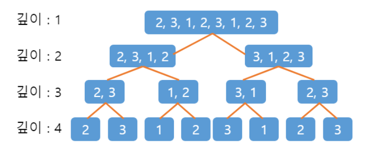 높이가 H인 포화 이진 트리가 주어진다. 트리의 리프 노드들에는 순서대로 길이 N인 수열 P가 반복되어 나타나며, 부모 노드는 자신의 왼쪽 자식 노드와 오른쪽 자식 노드의 수열들을 순서대로 가지고 있다. 예를 들어, H가 4고 수열 P가 {2, 3, 1}이라면 트리는 아래의 그림처럼 형성된다.