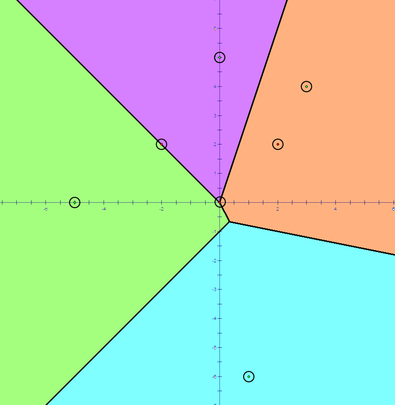 For example, in the picture above, every location over the plane is colored by the closest point with such location. The points which belongs to a single region is colored by a light color indicating a region, and the points which belongs to more than one region forms lines and points colored black.