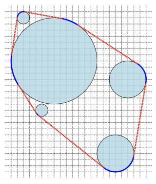 Zadano je n disjunktnih krugova u koordinatnoj ravnini. Rub njihove konveksne ljuske sastoji se od naizmjeničnih ravnih segmenata i kružnih lukova. Odredite duljinu najdužeg od tih kružnih lukova na rubu.