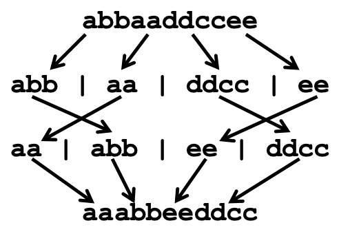 The resulting string in the above example is bitonic. Consider the first e. The string aaabbe is non-decreasing, and the string eeddcc is non-increasing. Tito achieved this with three cuts. Note that any string which is monotonic (uniformly nondecreasing or nonincreasing) is also bitonic.