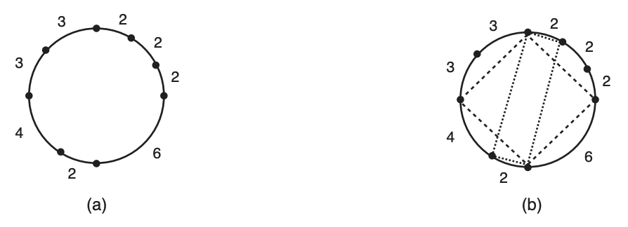 John is a meticulous person. In his farm he built a circular field with some trees planted right at the circumference of the field. Figure (a) below shows the field with the trees.