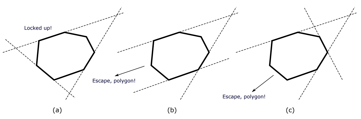 Figure (a) above illustrates a triple that will lock the polygon up. For (b), the lines do not define a triangle since two of them are parallel, and so the polygon will escape. In (c), the polygon lies outside the triangle defined by the triple and it will easily escape.