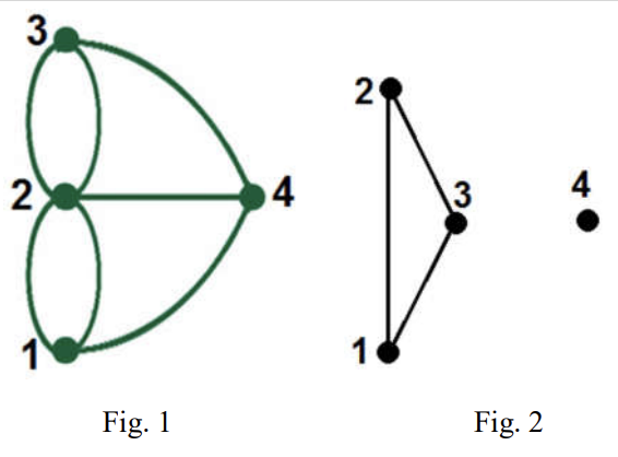 On Fig. 1 a scheme of 4 islands, presented by points and labeled from 1 to 4, and 7 bridges, presented by lines, each of them connecting 2 different points, are shown. Each bridge could be traversed in both directions. The task is to start from some island, to pass on each of the bridges exactly once, and to return at the starting point. Such walk is called all-bridgeswalk.