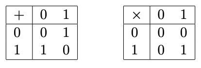 A finite field F2 consists of two elements: 0 and 1. Addition and multiplication on F2 are those on integers modulo two, as defined below.
