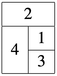 There is a tile of size 1 × 1 with color 1, a tile of size 1 × 2 with color 2, a tile of size 1 × 1 with color 3, and a tile of size 1 × 2 with color 1.