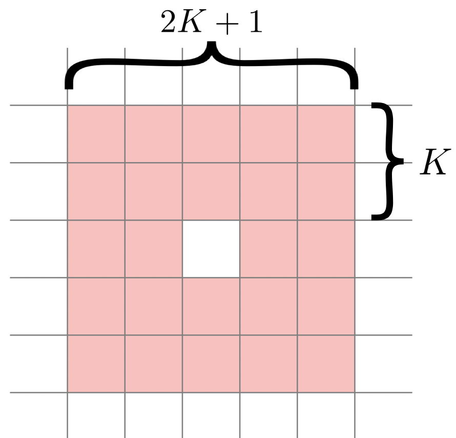 바둑판의 각 칸은 주위의 영향을 받는데, 주위란 <그림2>에서 색칠한 영역과 같이 현재 칸을 중심으로 둔 한 변의 길이가 (2K + 1) 인 정사각형에서 현재 칸을 제외한 영역을 말한다.