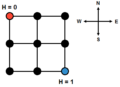Little Z also measured the altitude of the intersection at the north-west corner of city to be 0, and the altitude of the intersection at the south-east corner to be 1 (as depicted in the above diagram). However, there is no way to determine the altitudes of other intersections. Little Z would like to know in the most ideal situation (where you can freely assume altitudes for any intersection), what is the minimum total energy consumed by people climbing the slopes during rush hour?