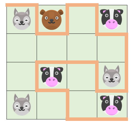 최근 서로 다른 종끼리의 잦은 갈등으로 인하여 서로 다른 종끼리 만니지 않도록 하나의 나라를 여러 개의 나라로 나누고자 다음 조건들을 만족하는 국경을 만들고자 합니다.