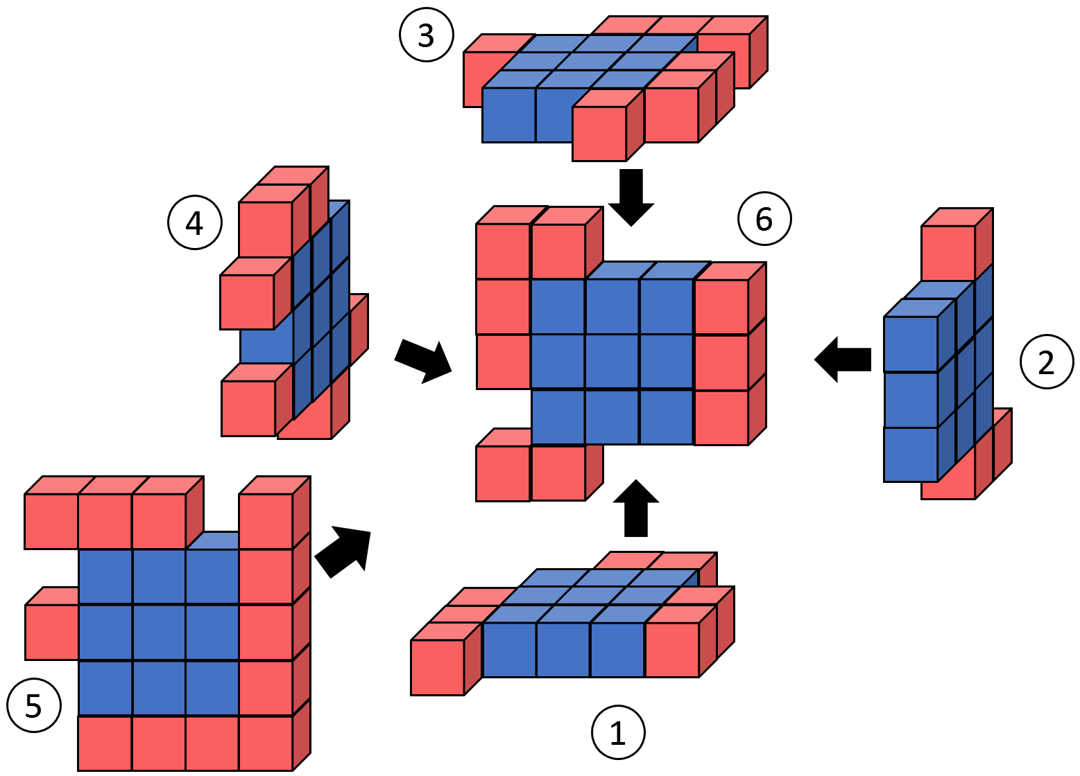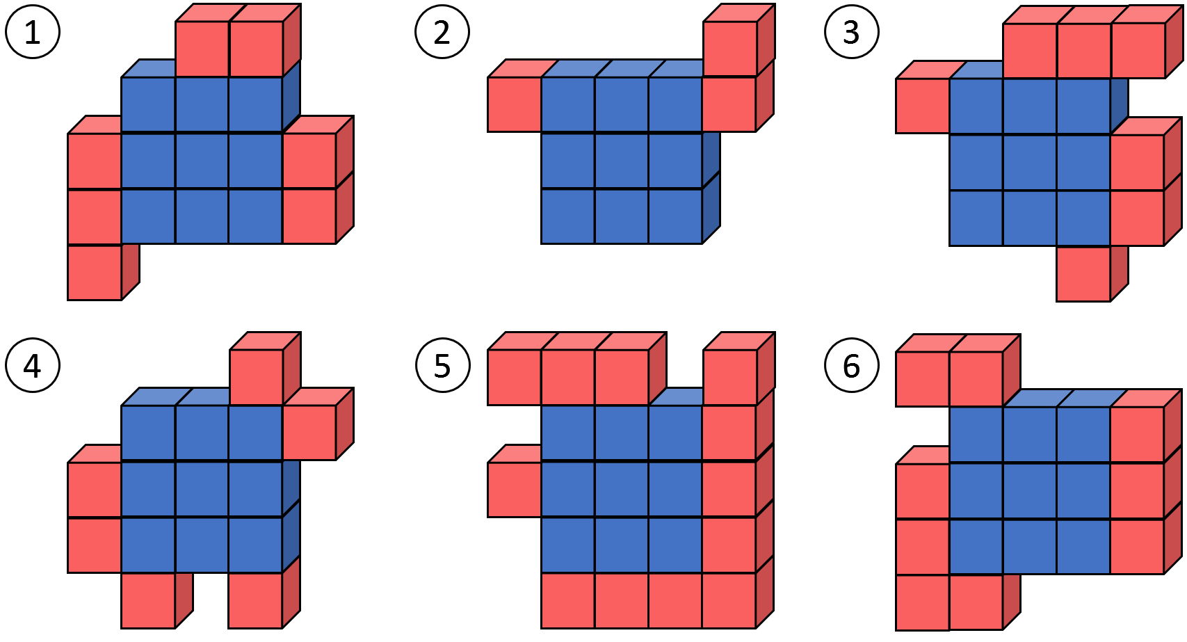 Each piece is connected with faces of its unit cubes. Pieces can be arbitrarily rotated and either side of the pieces can be inside or outside of the constructed cube. The unit cubes on the core area should come in the centers of the faces of the constructed cube.