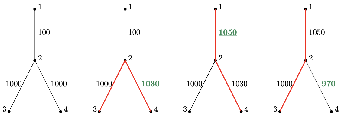As the weight of the edge {2, 4} decreases to 970, the most distant pair is suddenly {1, 3} with 2050.