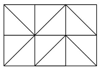 JOI 君は IOI の懇親会に参加している.懇親会ではサンドイッチが縦 R 行,横 C 列の正方形のマス目に 沿って配置されていた.サンドイッチは 2 辺がマス目の 1 辺の長さに等しい直角二等辺三角形の形をして おり,それぞれのマスには 2 個のサンドイッチが斜辺が接するように置かれている.下図はサンドイッチ の配置の例を表している.