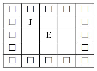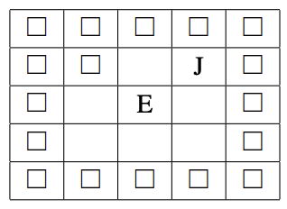 入力例 1 において,スケートリンクの初期状態は以下の通りである.白の四角形が書かれたマスは氷塊 を,J と書かれたマスは JOI 君の現在地を,E と書かれたマスは出口を表す.