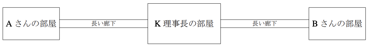 A さんと B さんは,図のように部屋に隔離されている.A さん・B さん・K 理事長の各部屋には内線電 話が設置されているが,電話を発信することが可能なのは K 理事長のみである.その他の連絡手段は断た れており,A さんと B さんは指示がない限り部屋から出ることはできない.